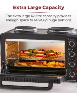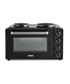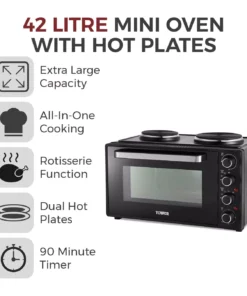 Cook with convenience using this compact Tower 42 litre mini oven. A perfect solution for busy kitchens, the mini oven offers all of the functionality of a conventional oven in one compact and easy-to-use worktop appliance. You can roast and bake a wide range of delicious meal by turning the easy to use dials. A rotisserie function is available for cooking juicy chicken with 1000W and 600W dual hotplates for heating up soups and sauces.