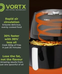 Exclusive to Tower Air Fryers, Vortx technology rapidly circulates hot air around food, cooking up to 30% faster than a conventional oven. Vortx also cooks food with little or no oil, making it much healthier, too! Lose the fat not the flavour with Vortx Air Frying Technology