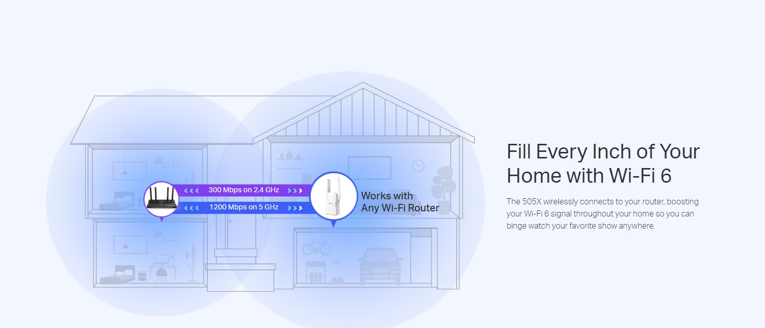 The 505X establishes a wireless connection with your router, extending the reach of your Wi-Fi 6 signal across your home, enabling you to indulge in binge-watching your favorite shows from any corner of your residence.