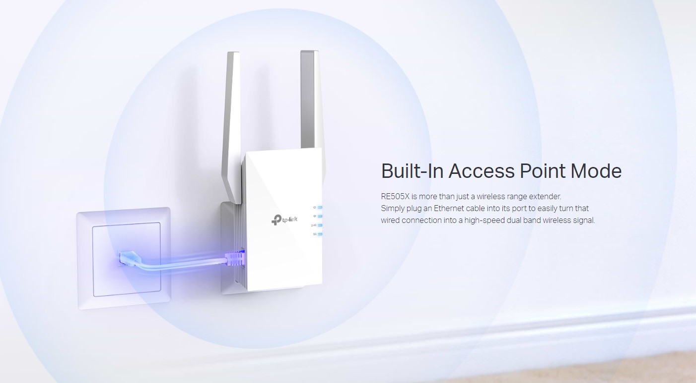 The RE505X offers more than the typical wireless range extender. It’s as simple as plugging in an Ethernet cable to instantly transform your wired connection into a high-speed dual-band wireless signal.