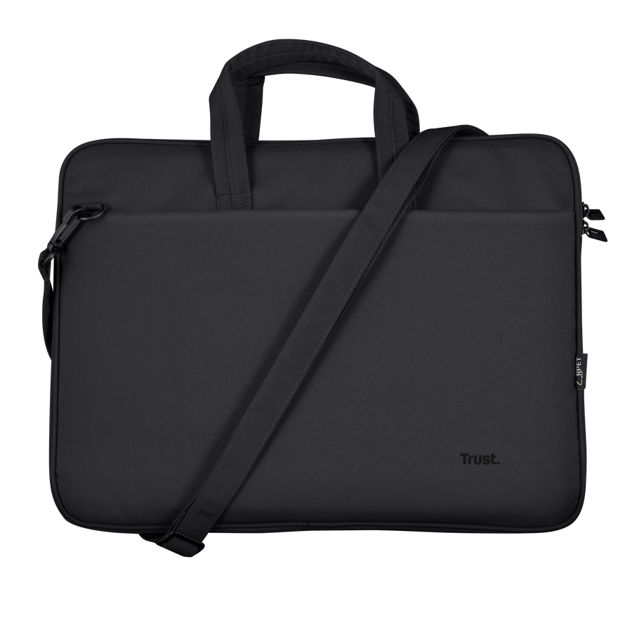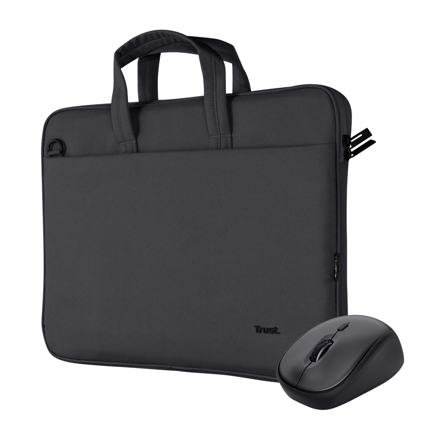 Eco-friendly set of 16″ laptop bag with silent wireless mouse, both made of recycled materials.