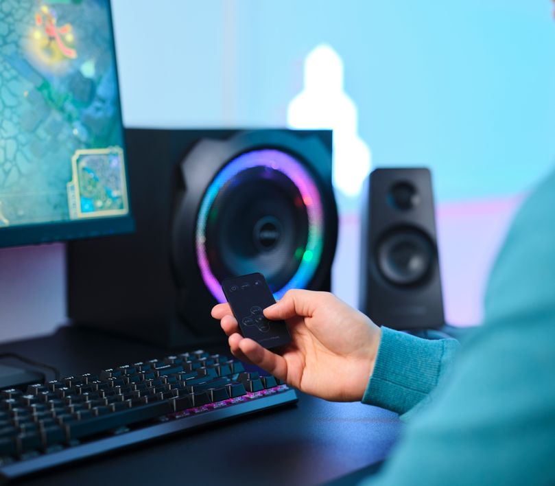 Powerful 2.1 speaker set with adjustable RGB LED illumination and wireless remote control