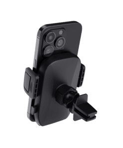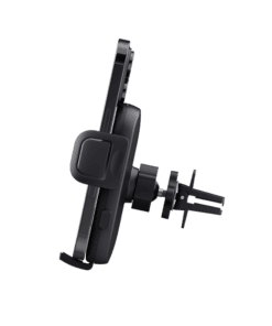 Car phone holder with air vent mount and rubberised grips, for hands-free calling.