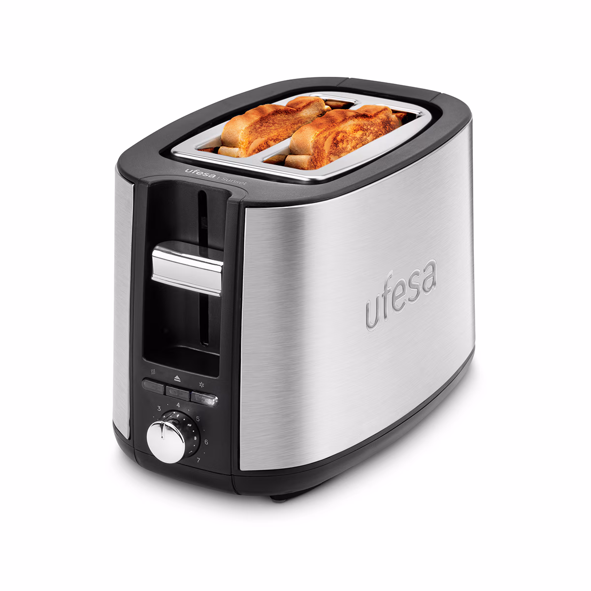 Brand: UfesaPower: 750WToasting Levels: 7-position electronic browning controlFunctions: Defrost, Reheat, CancelAdditional Features: Cord Storage, Removable Crumbs TrayWarranty: Parts 2 years & Labour 2 years