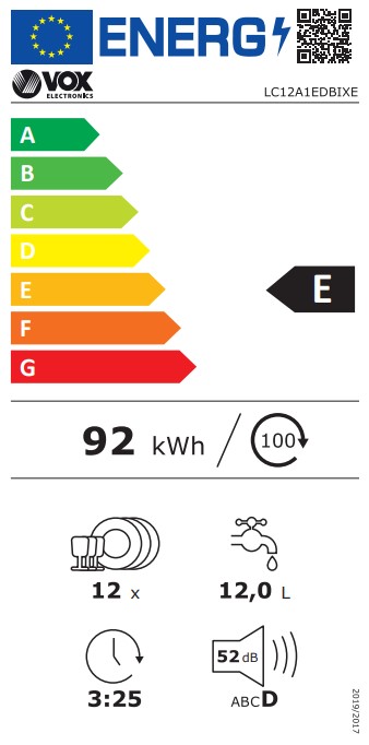 Brand: VOXDishwasher Capacity: 12 DishesDisplay: DigitalNumber Of Programs: Prewash, Quick 30min/40°C, ECO, Super 50min/65°C, Hygiene 70°C, Intensive 65°CNumber Of Tempretures: Temperature (°C) 40-50-65-70Energy Label: EEnergy Consumption: 92kwh per 100 cyclesWater Consumption: 12 litersNoise Level: 52dB, Class DAdditional Features: Cutlery basket, Half Load option, Hidden heating element, Pre-wash, Rinse indicator, Salt Indicator, Spillage protection, Start / Pause, Washing cycle indicatorDimensions: (WxHxD) 598x850x598 mmInstallation Type: Free-StandingDishwasher Size: 60cmWarranty: Parts 3 years & Labour 3 years