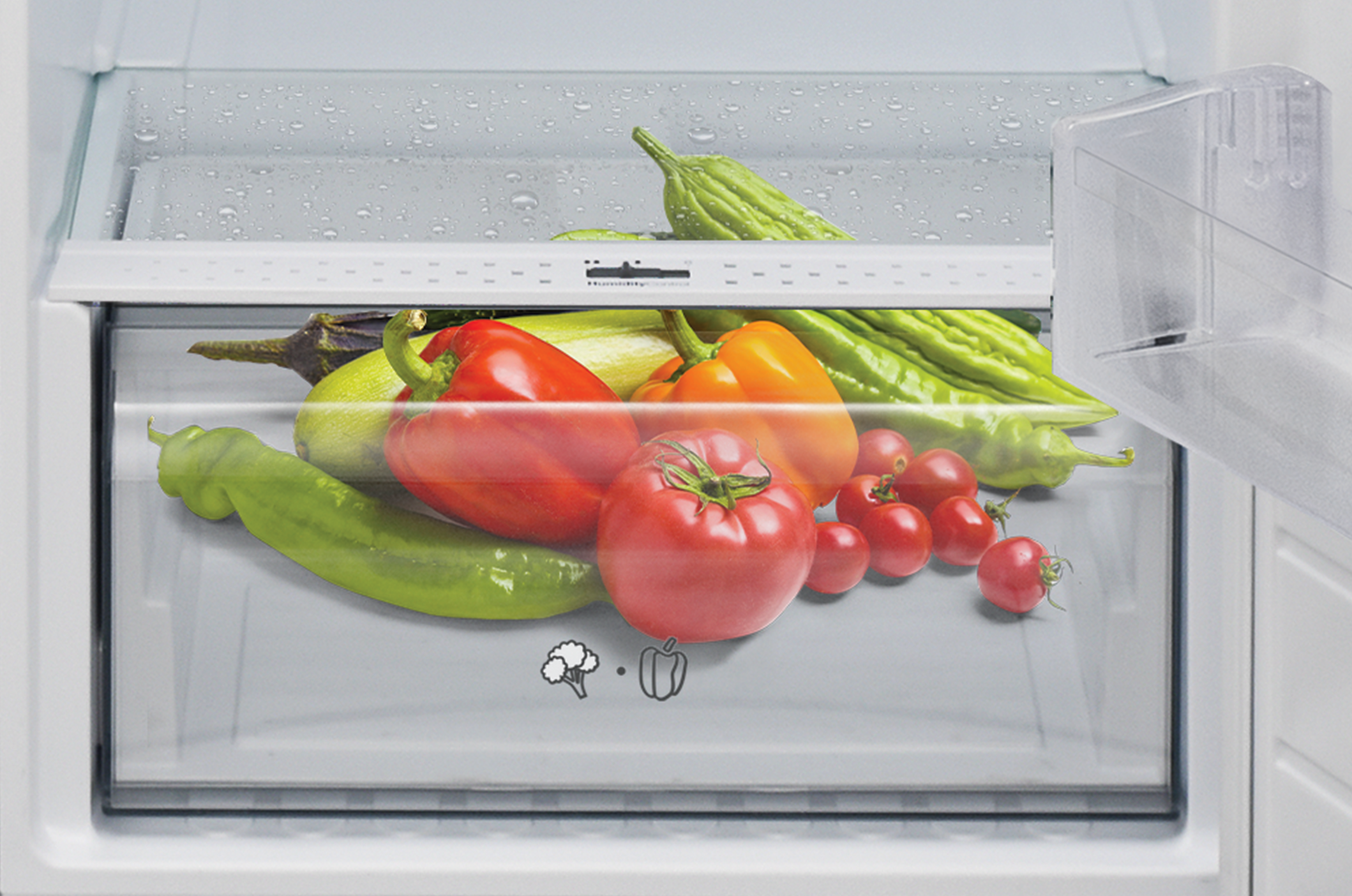 A drawer with a separate Humidity Control slider, which users use for adjusting air circulation and humidity level in order to keep fruits and vegetables fresh for a longer time.