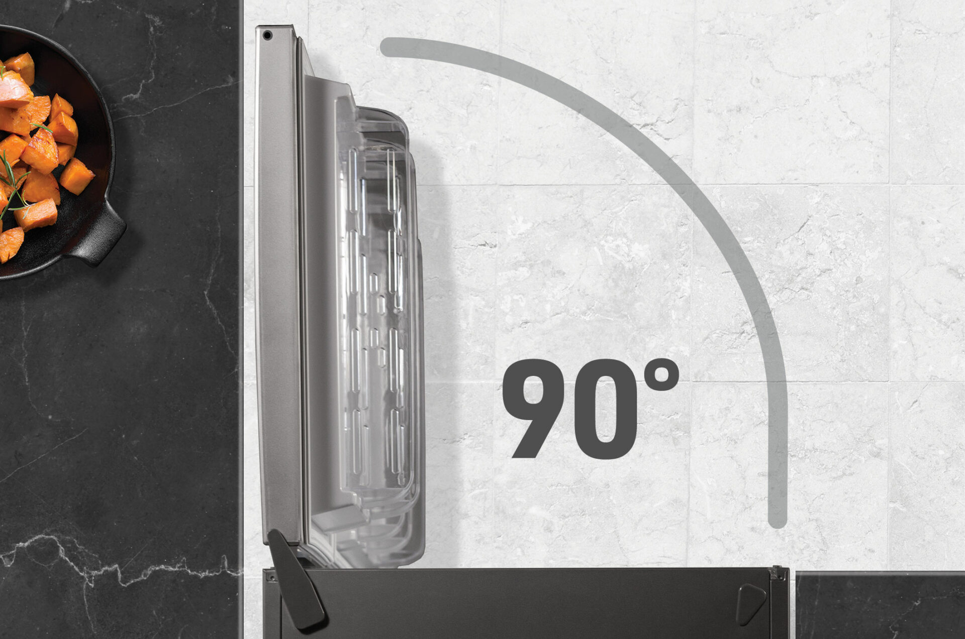 The appliance door opens at 90 ° angle, whereas the appliance width remains the same as when the door is closed. The drawers can open smoothly even when the refrigerator or freezer is placed in the corner of the room.