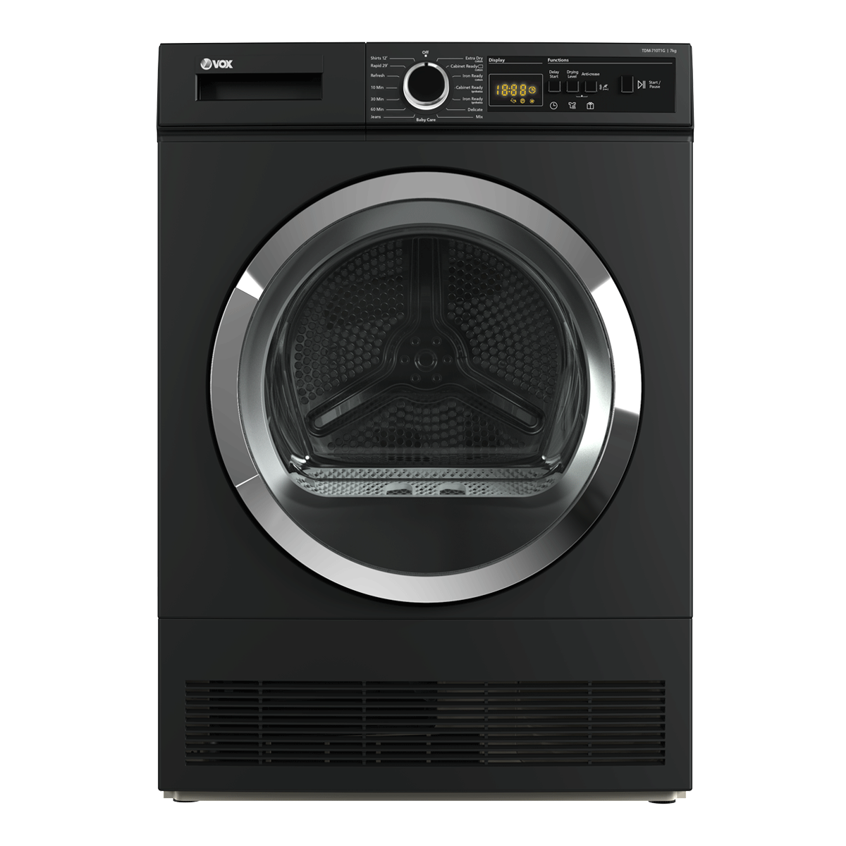 Brand: VOXLoad capacity: 7kgNoise Level: 65dbDisplay: LEDNumber Of Programs: 15 ProgramsProgram List: Cotton Cabinet Ready Program, Cotton Iron Ready Program, Drying 10 min Program, Drying 60 min Program, Mix Program, Refresh Program, Synthetics Cabinet Ready Program, Baby Care Program, Cotton Extra Dry Program, Delicate Program, Drying 30 min Program, Jeans Program, Rapid 29 min Program, Shirts 12 min Program, Synthetics Iron Ready ProgramFeatures: Delayed start, Drying level, Anti-crease, Start / PauseEnergy Consumption: 504kWh/AnnumEnergy Label: BInstallation Type: Free-StandingDimensions: (WxHxD) 596x845x523 mmWarranty: Parts 3 years & Labour 3 years