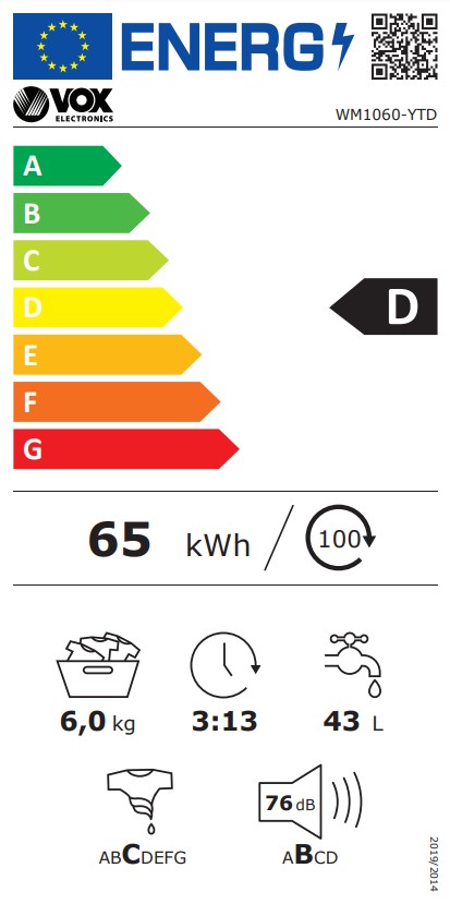 Brand: VOXLoad capacity: 6kgSpin Speed (RPM): Spin Variable 1000rpmNoise Level: Spinning Noise Level 76dBDisplay: LEDFunctions: Washing temperature button, Spin button, Delayed start button, Start / Pause buttonFeatures: AquaLogic, Child lock, Unbalance control systemNumber Of Programs: 15 ProgramsProgram List: Color Cotton, Cotton 60°C, Delicate 30°C, Jeans/Dark 30°C, Quick 15min/30°C, Rinse, Synthetics 40°C, Allergy Free, Cotton 20°C, Cotton Prewash, Eco 40-60°C, Mix 40°C, Rapid 60min/60°C, Spin, Wool 30°CColour: WhiteEnergy Label: DEnergy Consumption: 65 kwh per 100 cyclesInstallation Type: Free-StandingDimensions: Depth 50cm, Height 85 cm, Width 60 cmWarranty: Parts 3 years & Labour 3 years